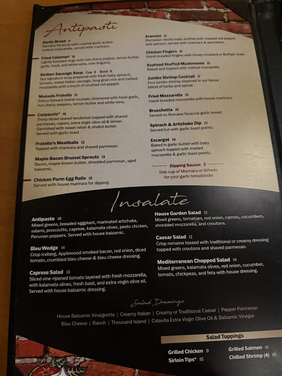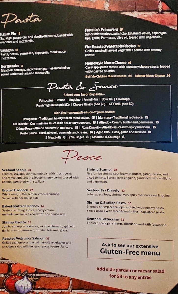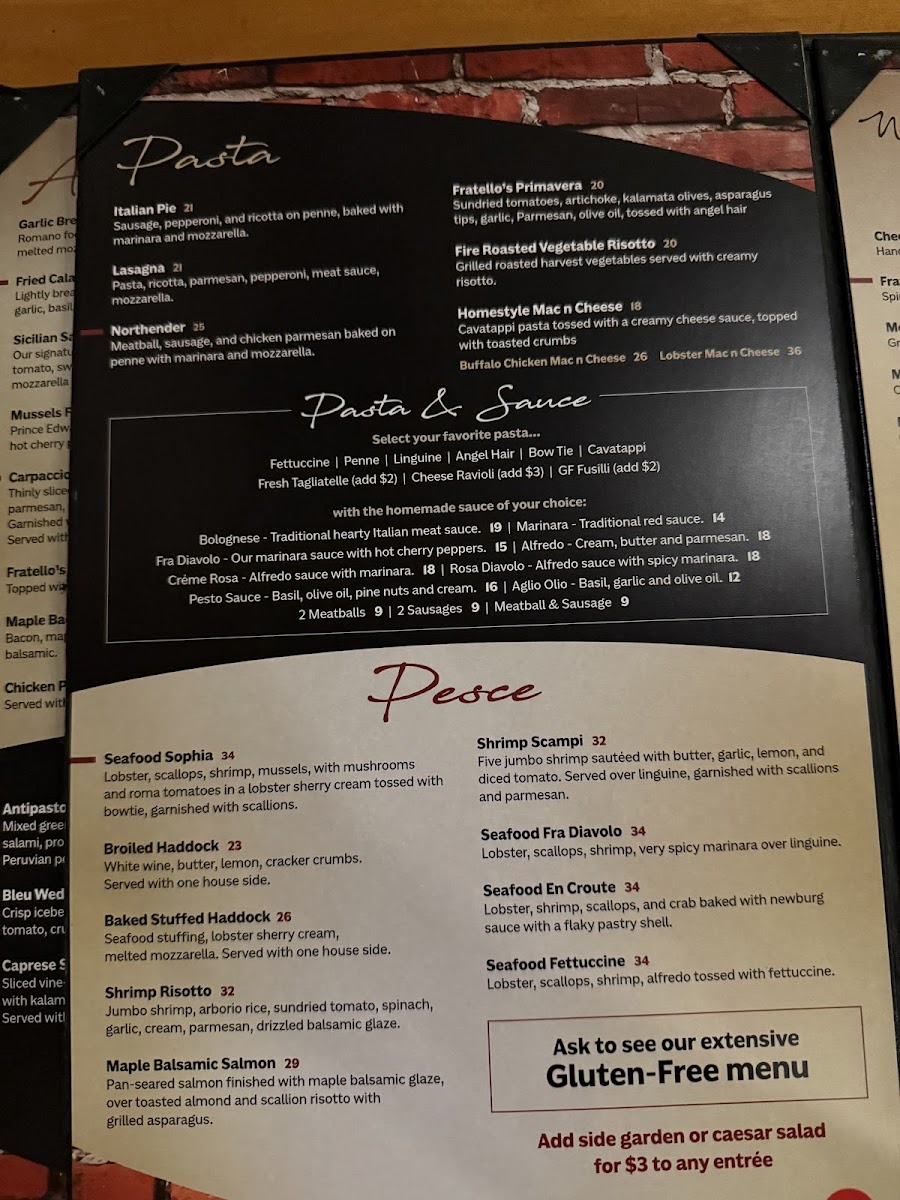 When you're craving authentic Italian flavors, look no further than the Fratello's Italian Grille Menu. Located at 799 Union Ave in Laconia, NH, this welcoming spot is perfect for a cozy meal with friends or family. The menu features a wide variety of delicious dishes, from classic pasta options to perfectly grilled meats, all crafted with fresh, high-quality ingredients. Whether you're in the mood for a comforting bowl of spaghetti, a flavorful pizza, or a savory seafood dish, Fratello's has something to satisfy every palate. With its warm atmosphere and expertly prepared dishes, this is the perfect place to indulge in a true taste of Italy.